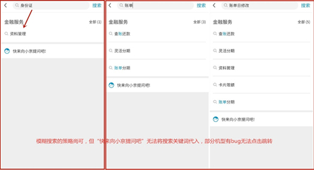 搜索互动方面,“首页”、“金融”、“商城”均有搜索入口,“搜索”功能页推荐热门搜索、有历史搜索,模糊搜索匹配程度尚可、结果罗列较为清晰,有联动客服的入口,但无法将所搜内容代入客服。此外,实测中发现,部分安卓机型的智能客服虽有入口缺无法完成跳转动作。