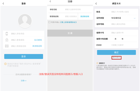 北京银行掌上京彩APP注册流程较为清晰,持卡/非持卡用户均可注册。用户注册成功后,可以选择绑定信用卡,也可以选择跳过该步骤,直接进入首页。不足之处在于,添卡过程中不支持OCR识别信息。