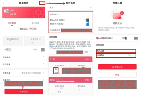 在操作体验方面,缤纷生活APP账单查询、快捷还款等常用功能均可一步到位。由于中国银行一张信用卡一个账单,所以APP“账单服务”采用了“单卡查询+切卡”的模式,可以查询已出账单、未出账单和历史账单,在有账单的情况下交互了“快捷还款”功能。值得注意的是,APP还提供了“综合账单”,可以查看本人整体欠款情况。此外,用户“还款”结束之后,可以看到待还金额/当前额度,也可以分享给好友下载APP(不过用户“还款”,可能很难诱发“分享”动作)。