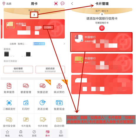 卡片管理方面,中国银行缤纷生活APP“用卡”顶部可以滚动查看已绑信用卡情况,但需点击“+”才能进入“卡片管理”功能页。用户可以查看所绑本行卡片及他行卡片,也可以添加/解绑卡片,且展示了卡片。用户点击单张卡可以看到账户情况、查询账单、快捷还款等,也可以进行交易密码、交易限额管理,设置安全锁、挂失/补寄、账单补制等。整体来看,“卡片管理”关联了很多功能,但和卡片相关的常用功能却没有覆盖,比如不支持查询/复制卡号、不能进行第三方支付管理。