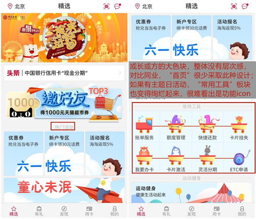 另外两个频道“有礼”和“发现”,虽然一个整合商圈和主题信用卡、一个聚焦服务专区,但页面均“简单粗暴”的罗列了推广图。从用户的视角来看,不仅区分不清两个频道的名字,而且也很难get每个频道的重点。