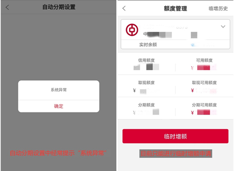 额度管理方面, APP可以查看信用/取现/分期等额度,也支持临时增额,暂不支持调整固定额度。