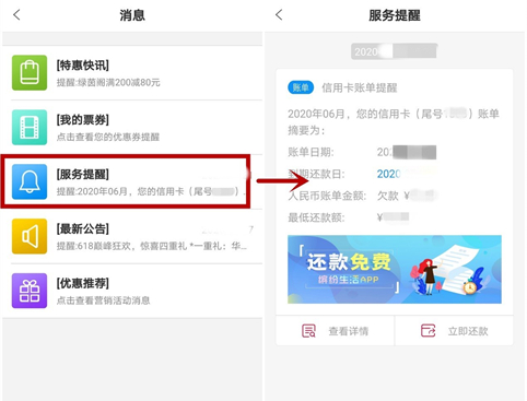 消息互动方面,缤纷生活APP“首页、信用卡、我的”三个频道均设有“消息”入口,且整合了特惠快讯、我的票券、服务提醒、最新公告和优惠推荐,但不支持个性化设置。此外,App会推送账单提醒,但消费/还款等交易暂时没有推送消息。