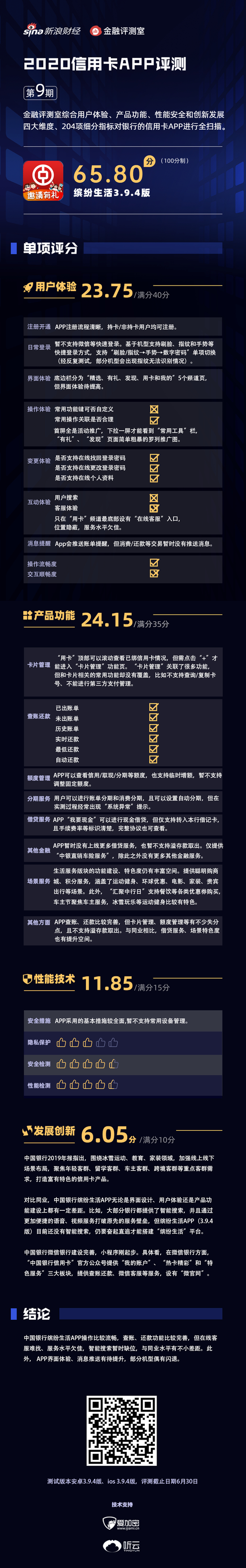 金融评测室综合用户体验、产品功能、性能安全、创新发展4大维度,200多项细分指标对中国银行信用卡缤纷生活APP进行全扫描,最终给予65.80分(总分100)。