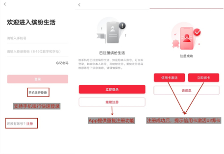 中国银行缤纷生活APP注册流程清晰,持卡/非持卡用户均可注册。用户 注册完成后,APP提示“信用卡激活”和“立即绑卡”,但添卡过程中不支持OCR识别银行卡信息等。值得注意的是,缤纷生活App提供重复注册功能,一定程度上解决了异常登录问题。