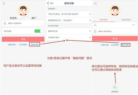 登录方面,工银e生活APP支持手机号登录,也支持卡号/用户名登录,同时可以微信快速登录。APP基于机型支持刷脸、指纹和手势等快捷登录方式,仅可以进行“刷脸/指纹→手势密码→账户密码”的单向切换。若用户忘记登录密码,APP支持在线找回。