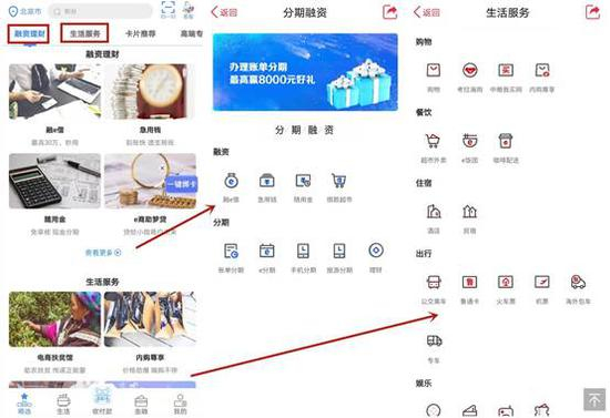 生活服务方面,APP支持扫一扫、收付款码等支付服务,也提供购物商城、积分商场和分期商城。不过,积分查询功能仍待完善,APP“我的→我的积分”可以显示总积分,但缺乏到期日、积分明细等。