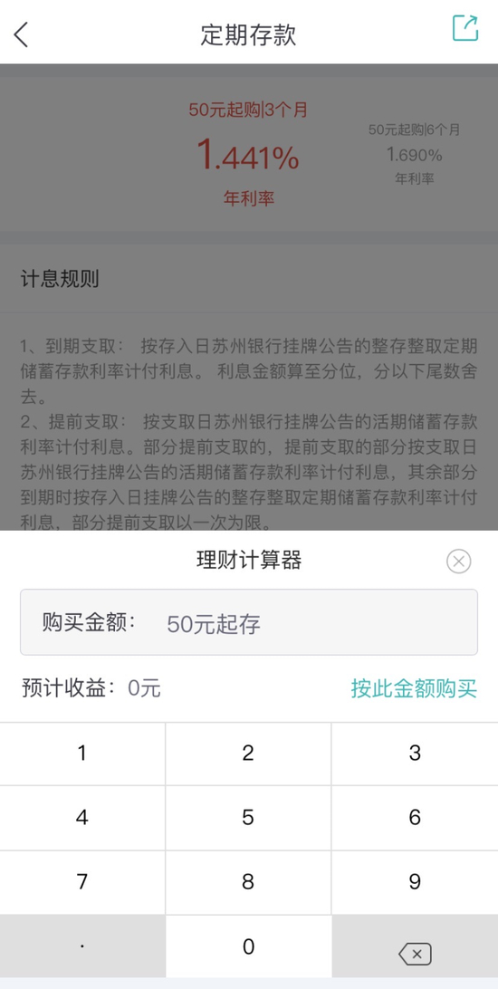 银行存款方面,APP上线一款定期存款产品,存款期限在3个月到三年间不等,起购金额均为50元,产品收益缺乏吸引力。在购买页面下方设有“理财计算器”,可根据购买金额计算预期收益。