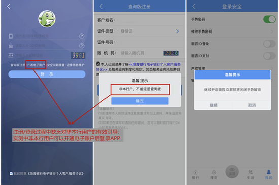 渤海银行本行用户可通过APP自助注册查询版,但不支持非本行用户注册,也缺乏有效引导:非本行用户需要自己发现“开通电子账户”进行开户再登录APP。而多数同业已将注册和绑卡流程分离,即便没有分离也会提示引导非本行用户先开户。