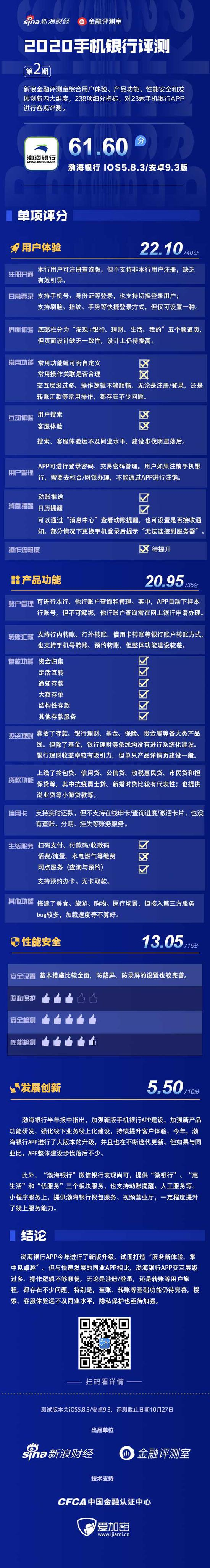 金融评测室综合用户体验、产品功能、性能安全、创新发展4大维度,238项细分指标对渤海银行手机银行APP“渤海银行”进行全扫描,最终给予61.60分(总分100)。