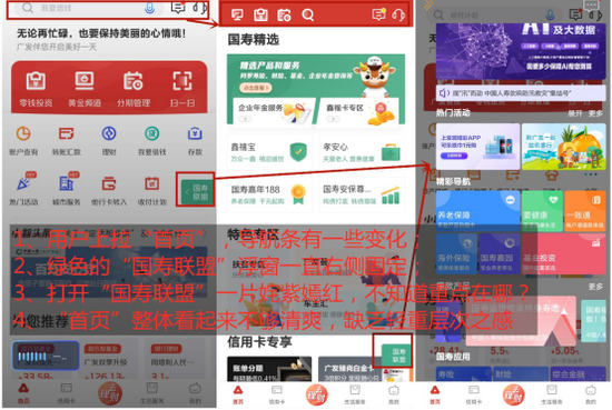 与去年评测一样,广发银行APP底边栏划分为“首页、信用卡、去理财、生活服务、我的”五个频道页。具体来看,APP“首页”进行了改版,自上而下分为“导航、固顶功能+头图、常用功能、小智头条、推广图、为您推荐、惠享商城、国寿精选、特色专区和信用卡专享”。值得注意的是,用户上拉“首页”,导航条会发生变化——固定6个常用功能;用户下拉“首页”,会进入5.0版本介绍;同时,“国寿联盟”绿色浮窗固定在“首页”右侧,且无法关闭——点开“国寿联盟”可以看到各种颜色绚烂的推荐版块,观感不太美好,整体不够清爽。