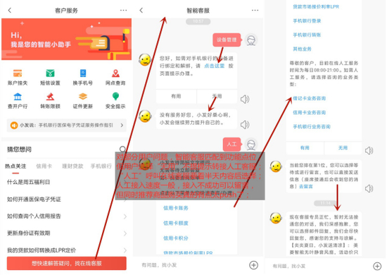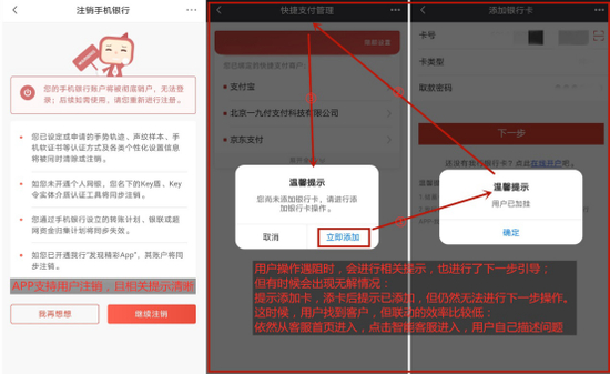 若用户旅程受阻,广发银行APP给出了相关提示,部分操作也进行了下一步的引导,但遇阻时与客服的联动效率较低。