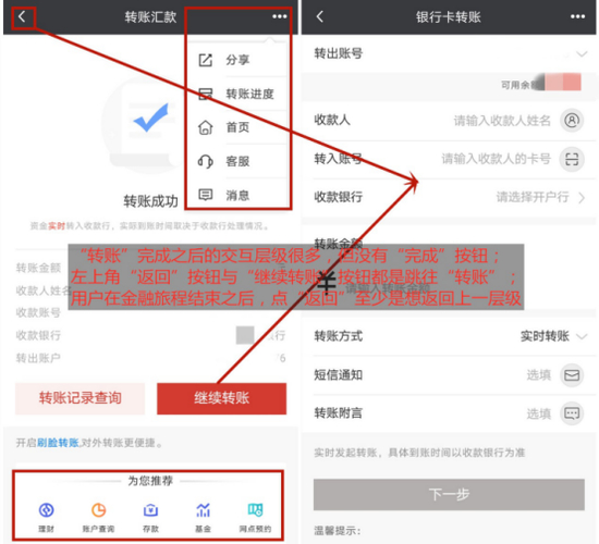 常用操作方面,广发银行APP用户可以快速找到账户查询、转账汇款、扫码支付等功能入口,常用操作之间的交互也比较合理,但仍有可提高之处:以“银行卡转账”这一金融旅程为例,转账结束后的交互层级很多,但没有“完成”按钮,并不太符合用户的心理和认知;左上角“返回”与“继续转账”均跳往“银行卡转账”操作,“返回”的意义何在呢?