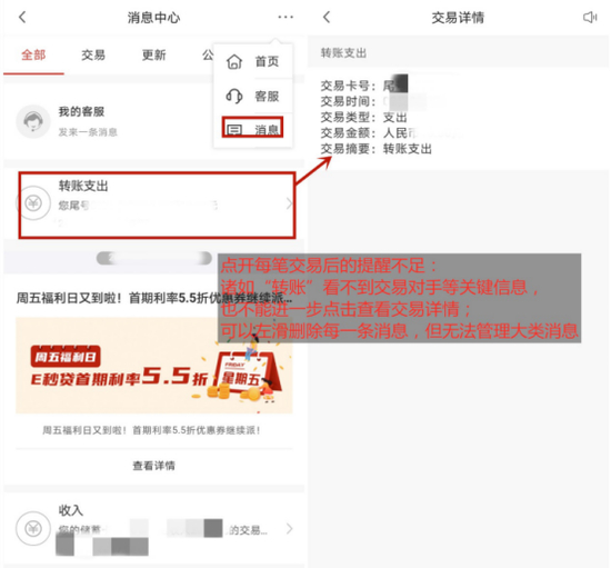 消息互动方面,广发银行APP“消息中心”整合了交易、更新、公告和资讯。用户每一笔交易,APP会进行弹窗提示。但“消息中心”的建设仍有较大提升空间:第一,用户进入消息中心,默认“全部”页面,用各种形式展现了各种消息,看起来比较混乱;第二,用户可以通过左滑删除每条消息,但不可以对大类别进行管理;第三,点开每笔交易后的提醒不足,诸如“转账”看不到交易对手等关键信息,也不能点击查看详情;第四,右上角“…”入口仍有“消息”入口,不够细致。