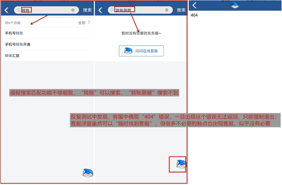 客服互动方面,上海银行APP可以开启客服悬浮窗,优点是可以随时找到客服,缺点是无论从哪个触点都要从“客服首页→问小海”进入客服,也不能根据触点匹配智能客服内容。具体而言,“我的客服”功能页整合了一些常用功能点、常见问题,但常见问题很多推广性内容,不太符合用户对客服的定位。智能客服逻辑比较完善:提问→回答→解决/未解决,未解决提示转接人工服务;人工客服水平尚可,但对话中不支持上传图片,也不支持语音转文字。值得注意的是,在反复测试中发现,客服偶现404,一旦404就无法返回只能强制退出。