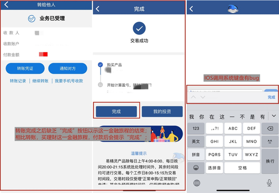 整体交互方面,上海银行APP可以快速找到账户查询、转账汇款、扫码支付等,常用操作之间的交互也比较合理,但仍有可提高之处:以“转账汇款→转给他人”这一金融旅程为例,转账结束后提示“业务已受理”,但没有“完成”按钮,并不太符合用户的心理和认知;IOS系统下,客服对话调用系统键盘,且有遮挡(如果用户选择使用第三方键盘,则可能调不出中文键盘)。
