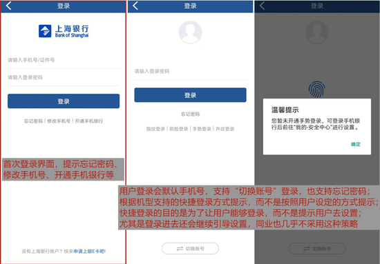 上海银行APP支持手机号/证件号登录,暂不支持微信授权等快速登录。APP支持刷脸、指纹、手势、声纹密码等快捷登录方式,但切换逻辑待提升:按机型支持的快捷方式提示切换,而不是按照用户设定的快捷方式切换。用户忘记密码,可以在线找回;若在非绑定设备登录手机银行,需要手机接收验证码。