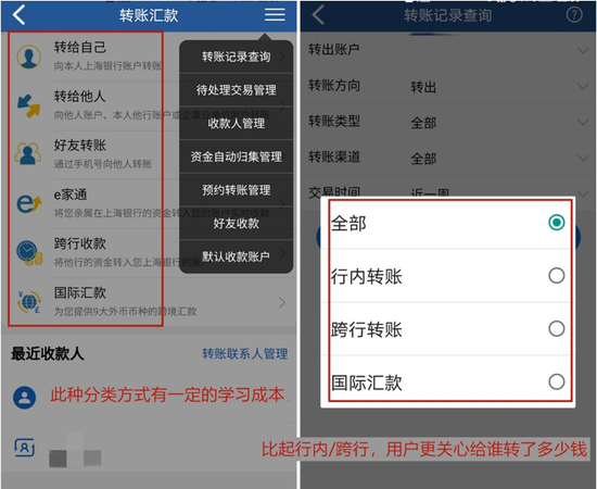 与大部分同业做法不同,上海银行APP转账汇款根据“人”进行设置,提供了“转给自己、转给他人、好友转账、e家通”等6种方式,不能说不合理,但有一定的学习成本:转给自己的他行账户,从用户角度理解肯定是转给自己,但根据小字介绍应该选“转给他人”;“e家通”什么意思?也要学习一下。除此之外,转账记录查询也要优化——所谓的转账类型、转账渠道更多是银行用语,用户更想查询的是“什么时间给谁转了多少钱”。