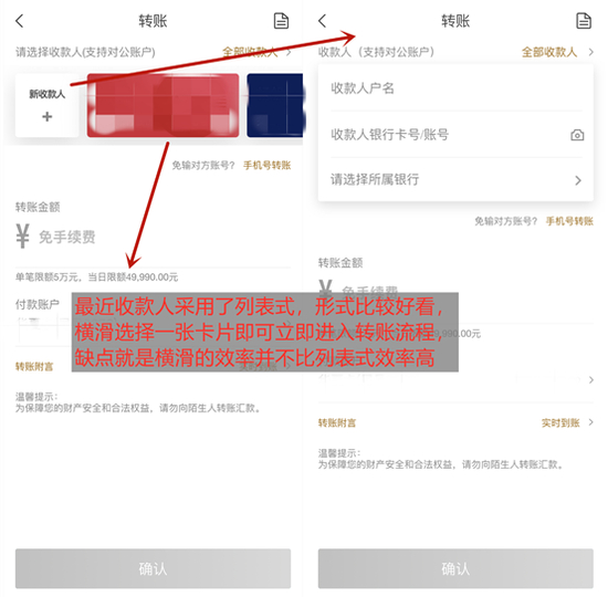 快捷转账上,APP支持最近收款人快速转账、可以对收款人开通“免短信验证码”转账,也支持“复制卡号打卡APP诱发转账”等。