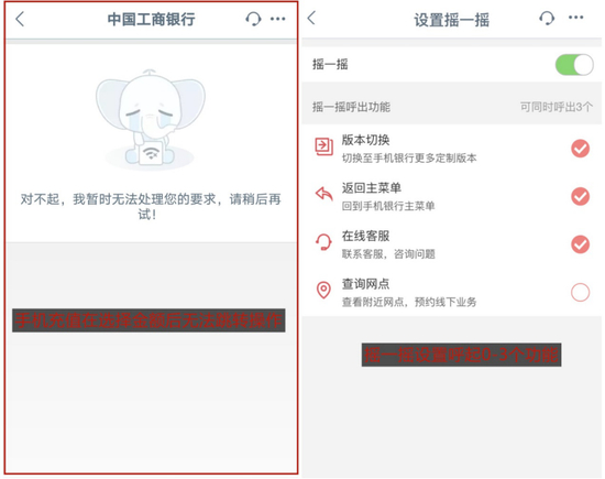 快捷互动方面,APP“搜索”可以切换到语音助手,语音识别准确度尚可(不支持二次编辑),支持语音转账、查余额、还款缴费等,但个别操作无法跳转。此外, 用户可以在“设置→摇一摇”里设置摇一摇呼出版本切换、返回主菜单、在线客服、查询网点。
