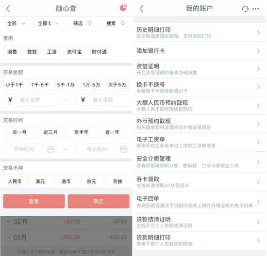 中国工商银行APP“我的账户”可以查看下挂的本行/他行账户,也可以添加/删除账户。对于单个账户,用户可以查询/复制卡号、查余额、查明细,也可以设置闪付免密、挂失账户等。此外,申领过电子银行安全介质的用户可以申请Ⅱ类、Ⅲ类账户。具体到“查询明细”,默认展示近一个月的交易明细,点击右上角“更多查询”可以查看6年以内的交易明细,且明细展示清晰;“随心查”支持按交易类型/金额等筛选交易,也支持按户名、账户等搜索交易。