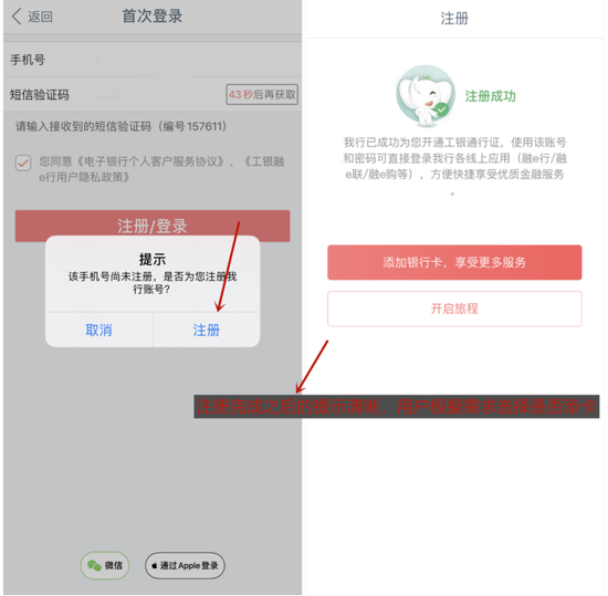 中国工商银行APP实现了注册与绑卡流程的分离,新用户输入手机号及短信验证码、设置登录密码即可完成注册。注册之后,用户进行身份验证,添加本行卡或他行卡。在注册环节,APP支持OCR识别身份证和银行卡信息。