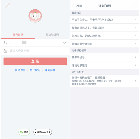中国工商银行APP默认手机号登录(可切换卡号/用户名登录),也支持微信、Apple ID授权快速登录。APP基于机型支持刷脸/指纹、手势等快捷登录方式,支持从“刷脸/指纹→手势→密码”的单向切换。如果用户忘记密码,可以在线找回;如果遇到问题,可以查看帮助提示——分为“登录相关”、“电子银行相关”和“银行卡相关”三类,较为全面和实用。值得一提的是,用户也可以选择短信验证码快速登录。
