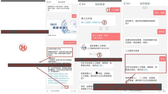 其中,智能客服仍有提升空间:第一,用户提问→智能回复→满意/不满意,但不满意不提示转接人工服务;第二,部分问题仅回复路径,没有匹配到功能点,还可更进一步。用户可以在07:00-22:00之间输入“人工”等关键词转接人工客服,但至少需要3次交互才能进入人工客服,结束后也没有设置评价选项;此外,一次人工客服结束后,再次进入客服直接转接人工客服,不够合理。