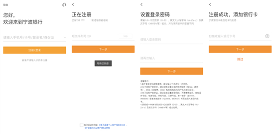 宁波银行APP注册流程比较清晰,新用户输入手机号+验证码,设置登录密码后即可完成注册。注册完成后,本行用户可以添加银行卡,非本行用户可以在线开通电子账户,支持OCR识别银行卡号。