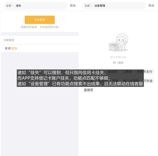 搜索互动方面,宁波银行APP在“首页、信用卡、理财、生活”4个频道设有搜索入口,支持查看热门搜索和历史搜索,支持对功能和产品的搜索,模糊搜索匹配程度有一定提升,但与同业水平仍有差距。此外,搜索失败后仍无法联动客服。