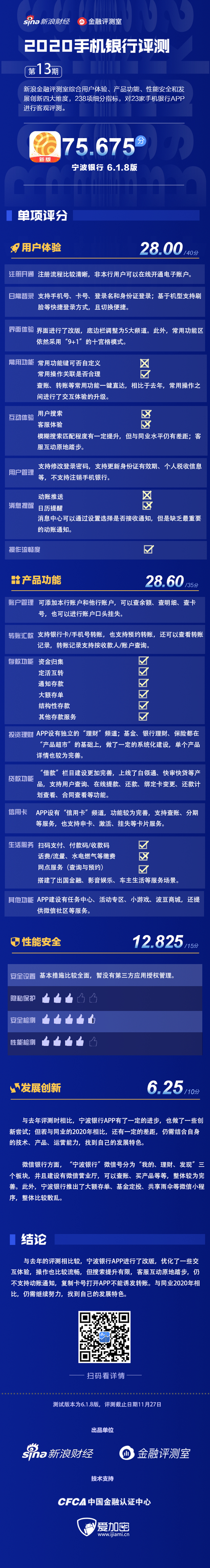 金融评测室综合用户体验、产品功能、性能安全、创新发展4大维度,238项细分指标对宁波银行手机银行APP“宁波银行”进行全扫描,最终给予75.675分(总分100)。