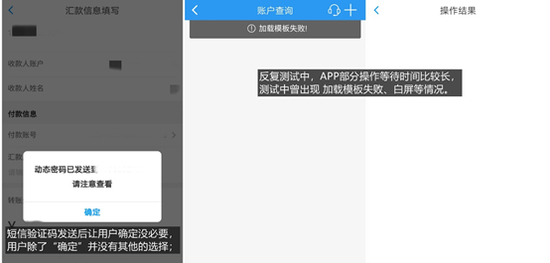 除此之外,APP部分交互设置仍可提高,比如部分操作中动态验证码发送后需要用户点击“确定”,但用户除了确定并没有别的选择。特别是,APP运行不够稳定,部分操作等待时间较长,在测试中曾出现过“加载模板失败”、白屏等情况。