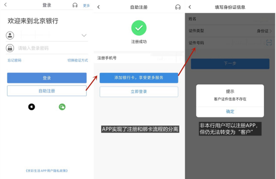 北京银行APP新用户输入手机号、短信验证码,设置登录密码即可完成注册。注册完成后,用户可以添加银行卡,但仍然只支持添加本行卡。整体来看,APP实现了注册和绑卡流程的分离,也支持OCR技术识别身份证、卡号信息,但II类账户体系仍不够开放。