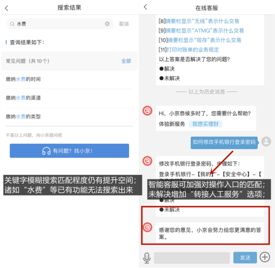 与去年评测时相比,北京银行APP提升了操作流畅度,客服体验也有了较大进步,但动账通知不够完善,搜索、智能客服的体验颗粒度仍可更细化。此外,用户旅程受阻时的处理策略仍待进化。