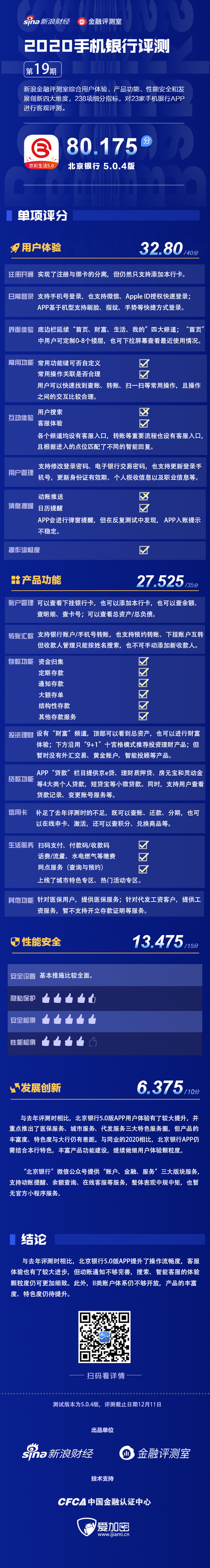 金融评测室综合用户体验、产品功能、性能安全、创新发展4大维度,238项细分指标对北京银行手机银行APP“京彩生活”进行全扫描,最终给予80.175分(总分100)