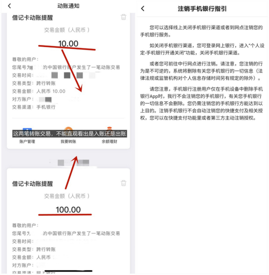 消息互动方面,中国银行APP“我的消息”整合了动账通知、业务提醒、营销优惠和服务公告,可以开启关闭信用卡/借记卡动账提醒,也可以已读/删除单条消息。用户每一笔交易,APP会进行弹窗提醒;每笔通知可以看到金额、时间、类型和对方账户等,关联了账户管理、我要转账等功能点。但遗憾的是,没有+/-等标识入账/出账金额,不够直观。此外,APP“我的→待办”提供“金融日历”服务,可以智能提示信用卡还款、存款到期日等事项。