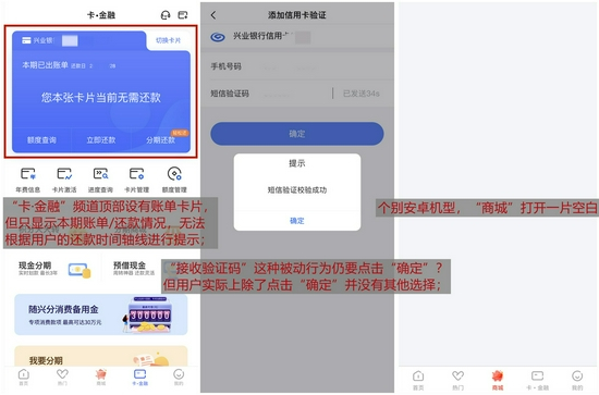 整体交互方面,好兴动App还款、分期等用户旅程比较顺畅,但查账的交互仍待提升:无论是“卡·金融”顶部的账单卡片、还是“账单查询”功能,均只显示本期账单/还款情况,仍需从用户视角提升体验——用户还款之后,更关心的是消费情况(虽然账单没出)。此外,App其他交互也有一些不足之处,比如部分步骤接收验证码后需要点击“确定”,在测试中部分机型打开“商城”一片空白。