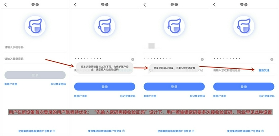 值得注意的是,用户在新设备首次登录需要“先输入密码、再接收验证码”,而同业一般是“先接收验证码、再输入密码”,看似差不多的用户旅程实则差很多——用户如果输错密码,需要多次接收验证码,用户旅程仍待优化。