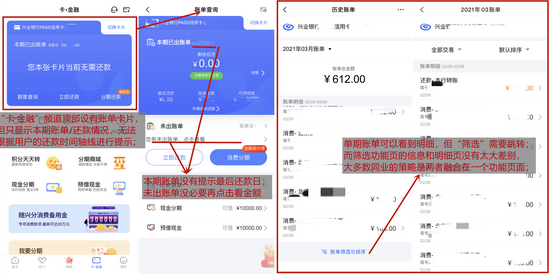 由于兴业银行一张信用卡一个单独账户,所以App“账单查询”采用了“单卡查询+切换卡片”的模式,整合了本期账单、未出账单和历史账单,支持近两年的历史账单查询,也支持账单日修改、账单补寄等服务。其中,账单明细的进出项较为清晰,支持按交易类型筛选、按金额/时间排序。