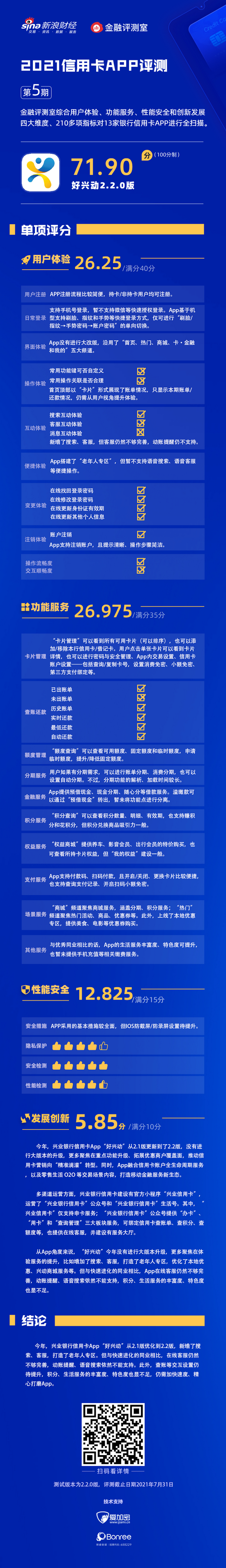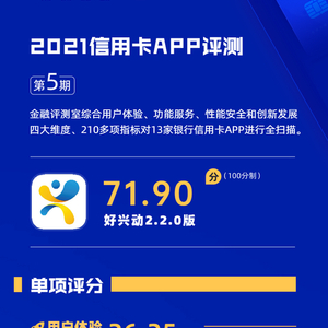 金融评测室综合用户体验、功能服务、性能安全、创新发展4大维度,210多项细分指标对兴业银行信用卡App“好兴动”进行全扫描,最终给予71.90分(总分100)。