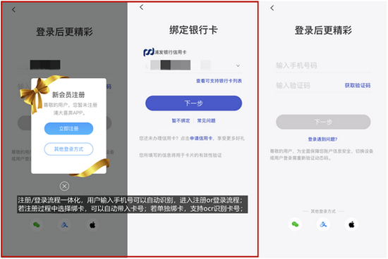 浦发银行信用卡App“浦大喜奔”注册流程简便,用户输入手机号、设置登录密码、填写短信验证码即可完成注册。用户注册成功后,可以绑定银行卡,且绑卡流程比较便捷。