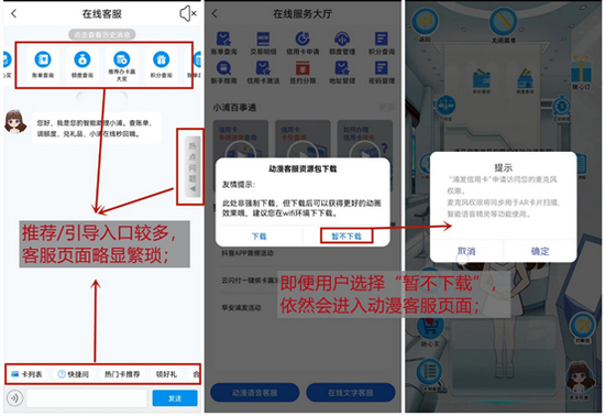 此外,用户点击“动漫语音客服”可以进入动漫客服,第一次进入动漫客服需下载资源包,语音识别等整体交互体验一般。在测试中发现,即便选择“暂不下载”,依然会下载完成并进入动漫客服。