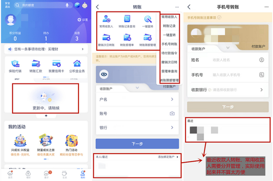 转账汇款方面,用户点击“转账汇款”默认进入银行账户转账流程,下拉屏幕或点击右上角“…”可以查看转账记录、手机号转账、管理转账限额等。与同业惯常做法不同,“转账汇款”通过“下拉/…”实现了相关功能的整合,好处是用户点击“转账汇款”可以直接开始转账,缺点是最近收款人转账、常用收款人需要分开管理,实际使用起来并不算太方便。