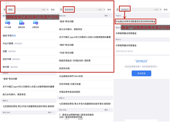 搜索互动方面,兴业银行App五大频道均设有搜索入口,可以查看历史搜索、热门搜索,支持对服务、产品、商城、资讯、活动等的全局搜索;用户输入搜索词时,可以进行关键词联想;关键词模糊搜索匹配程度尚可。与去年评测时相比,关键词搜索不到内容时可以咨询客服,并且代入/匹配了相关内容。不过,搜索结果的展示仍有可提升之处,比如基金产品搜索结果未显示代码。