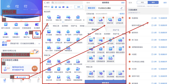 同时,用户可以通过“自定义首页”设置0-9个推荐模块,包括“可分享自定义模组”,而该模组可以再次自定义功能/产品。总体来说,“首页”共有4个自定义位置,虽然用户自定义权限提升了,但对用户来说略微太繁琐,重复性较强。