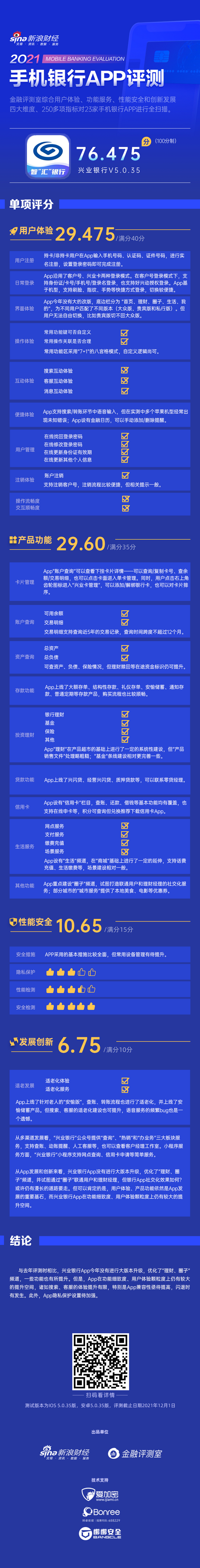 新浪金融评测室综合用户体验、产品功能、性能安全、创新发展4大维度,250余项细分指标对兴业银行手机银行App进行全扫描,最终给予76.475分(总分100)。