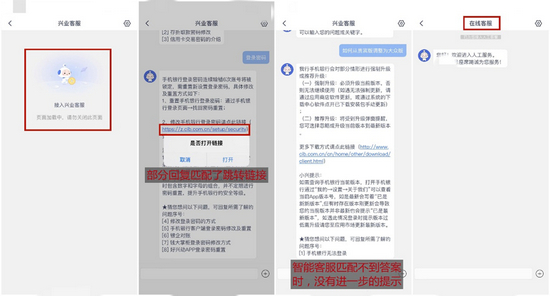 客服体验方面,兴业银行App在“首页、理财、圈子和我的”4大频道设有客服入口,部分功能触点也设有客服入口,但整体覆盖率待提高(安卓手机截屏可以联通人工客服)。与去年评测时相比,客服水平提升不大,仍有一些问题亟待解决:第一,客服接入有时滞,在反复测试中,偶现等待时间过长;第二,提问→回复,部分回复匹配了跳转链接,但不如同业处理得精细;第三,对用户提问,智能客服匹配不到答案时,没有进一步的提示(比如电话/人工客服提示);第四,用户输入“人工”等关键词后会跳入“在线客服”界面:接入时提示等待人数,服务中可以发送图片,服务后进行评价,但中途无法暂时退出,且出现过闪退情况。