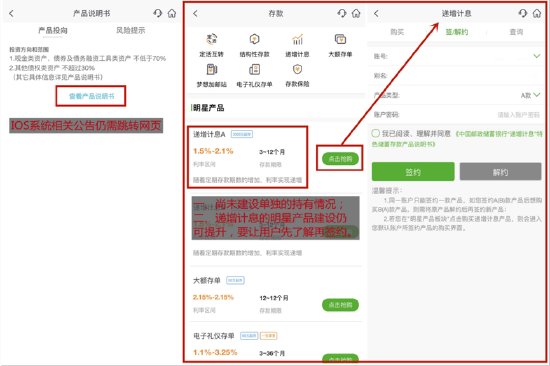 具体来看,银行理财、基金、保险等均在“产品超市”基础上进行了一定的系统化建设,较去年评测时有一定提升。其中,“银行理财”可以连通远程客户经理,单只产品展示、购买流程尚可,但IOS系统相关公告仍需跳转网页;“基金”进行了改版,单只产品建设也有所提升。不过,“邮益宝”作为主打的余额理财产品,仍有较大的改进空间;“风险评估”也仍有提升空间。