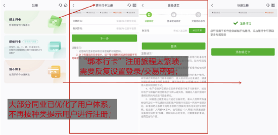注册方面,邮储银行App延续了去年评测时的注册策略,给用户提供了“绑本行卡、绑他行卡、暂不绑卡”三个选项。其中,“暂不绑卡”选择项下,用户输入手机号码、短信验证码、设置登录密码后即可完成注册,注册成功后提示添加银行卡。值得注意的是,“绑本行卡”选项下的注册旅程太过繁琐,用户需要先设置6位数字密码的初始登录/交易密码,注册成功后首次登录再次要求修改登录密码和交易密码,已不是同业主流做法。