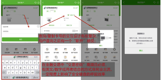 第二,App“密码体系”不太符合用户的使用习惯,突出表现在“绑本行卡”注册中各种密码的反复设置、以及6位交易密码(字母/数字)的设置上,而金融同业中交易密码多为6位数字(或与账户密码一致),这在一定程度上影响了关键交易页面安全键盘的便捷度(默认字母);第三,App流畅度较去年有所提升,但也有优化空间,测试中偶现“开小差”。